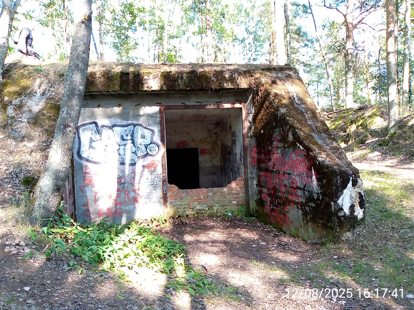 Выходим на остановке "Черная речка". Поднимаемся на уступ. Первый объект, у кот. мы остановились - бетонное сооружение, довольно хлипкое для обороны, скорей всего здесь был склад топлива для прожекторов для просвечивания берега залива. Это остатки "линии ВТ", линия обороны, кот.была построена финнами для противостояния Красной армии в 1942-44 гг от Ваммельсуу(Серово) до Тайпале (Соловьёво) вдоль Тайпелеенйоки (Бурная).