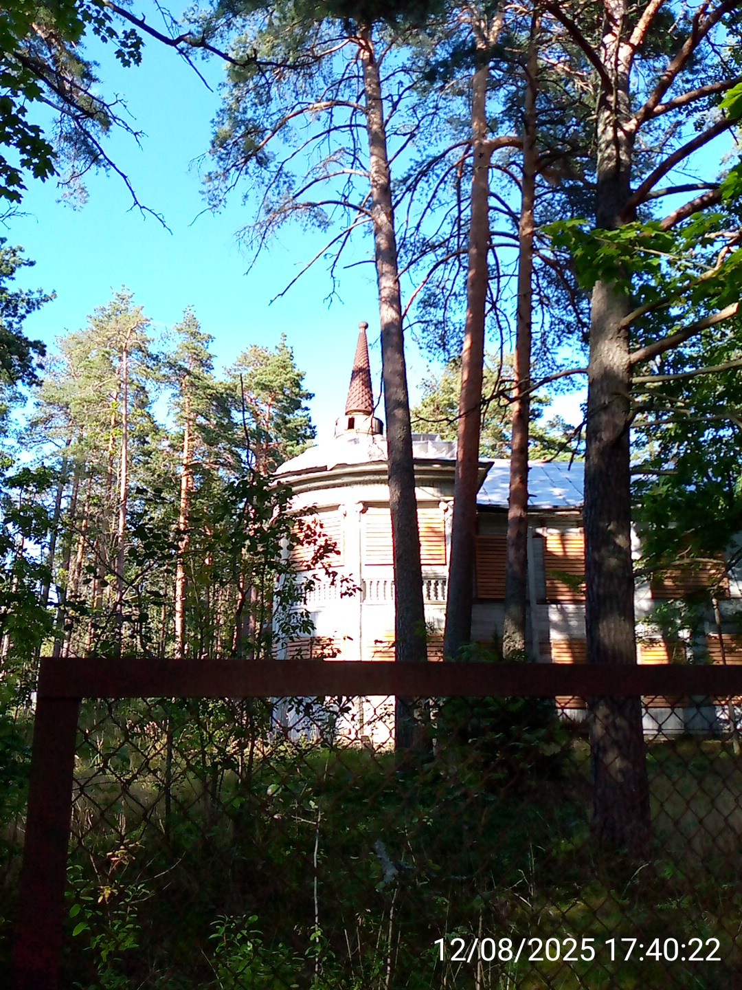 Вилла Мартинелли (с пианклем, островерхой башенкой). Жил Лукомский, искусствовед, занимался музеефикацией пригородных дворцов вместе с Корзухиным. В 1920 уехал во Францию, умер в Ницце в 1952 г. Газпром восстанавливает, сейчас в лесах частично. После революции уч-к и дом принадлежал священнику Рогенгагену. Оригинальные деревянные колонны начала 20 века, нигде больше таких нет.