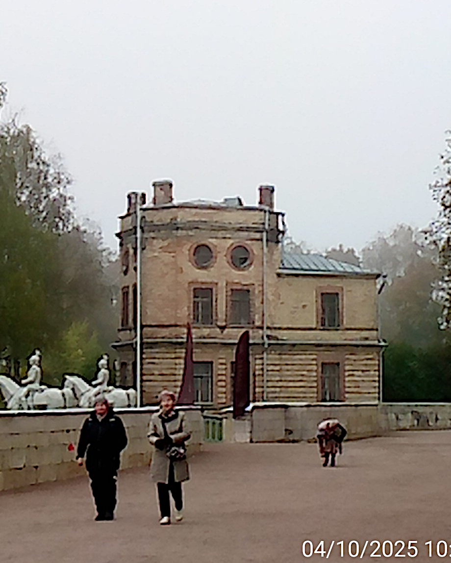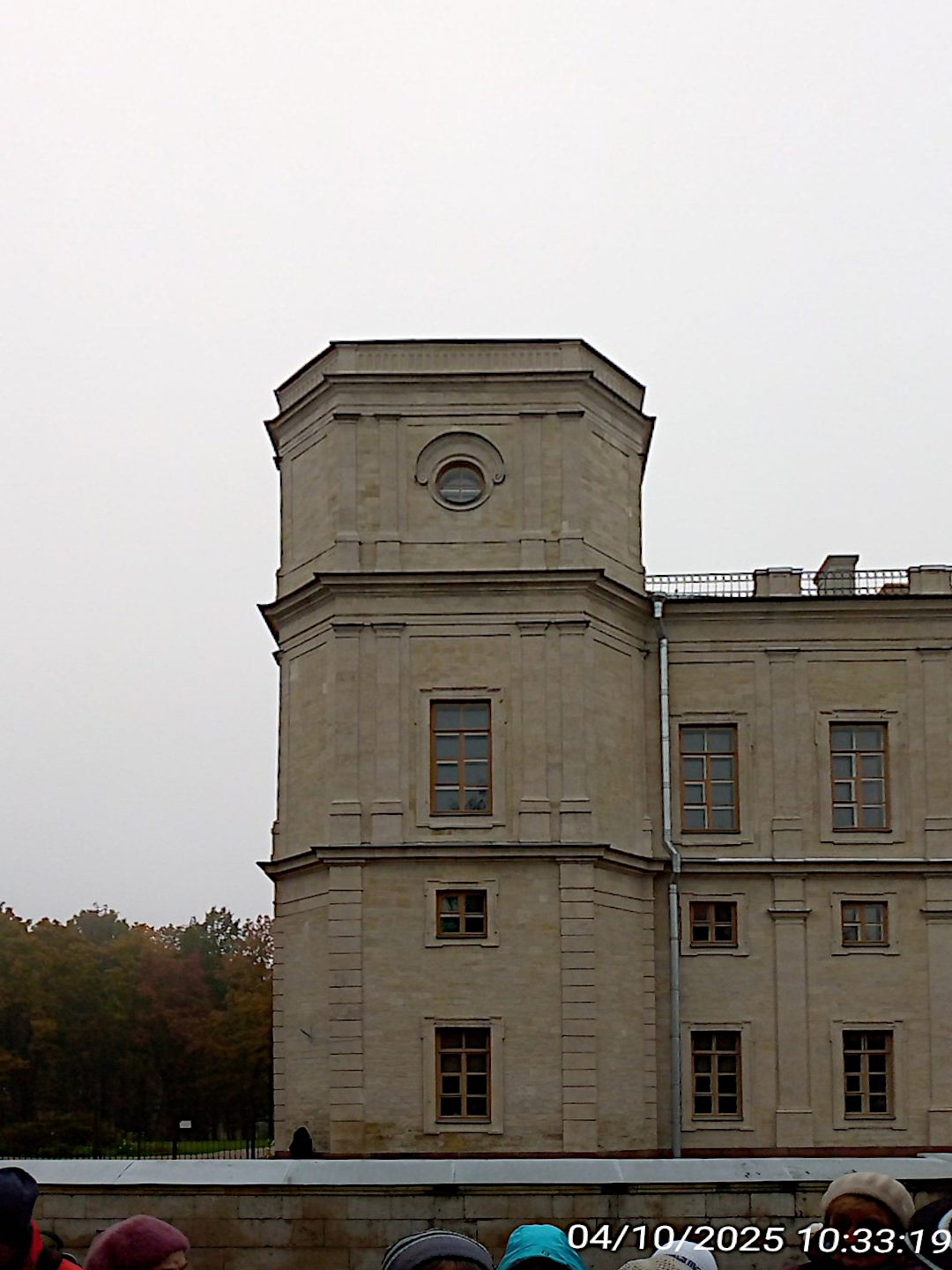 Дворец Приоратский и Черное озеро у нас справа. Подходим к Гатчинскому дворцу. На Дворцовой площади рассматриваем Кухонное и Арсенальное каре. Обращаем внимание на странное здание рядом. Это Екатеринвердер, часть проекта , кот. создал архитектор Бренна. Предполагались мощные башни ворот с двух сторон дороги с аркой для проезда. Они должны были повторять архитектуру башен Кухонного каре. Воплотить до смерти Павла успели только одну башню, она сохранилась.